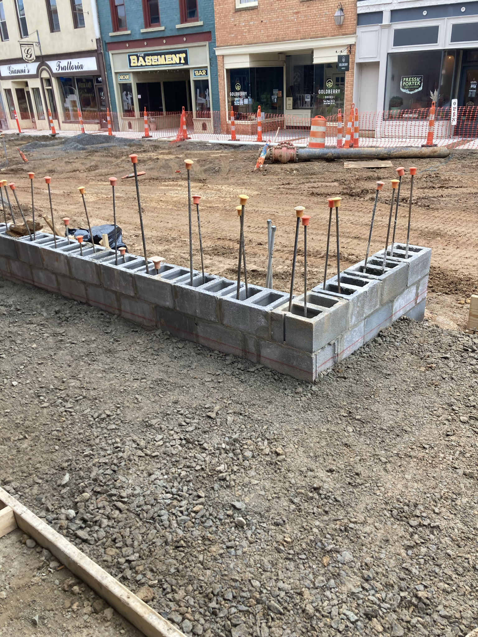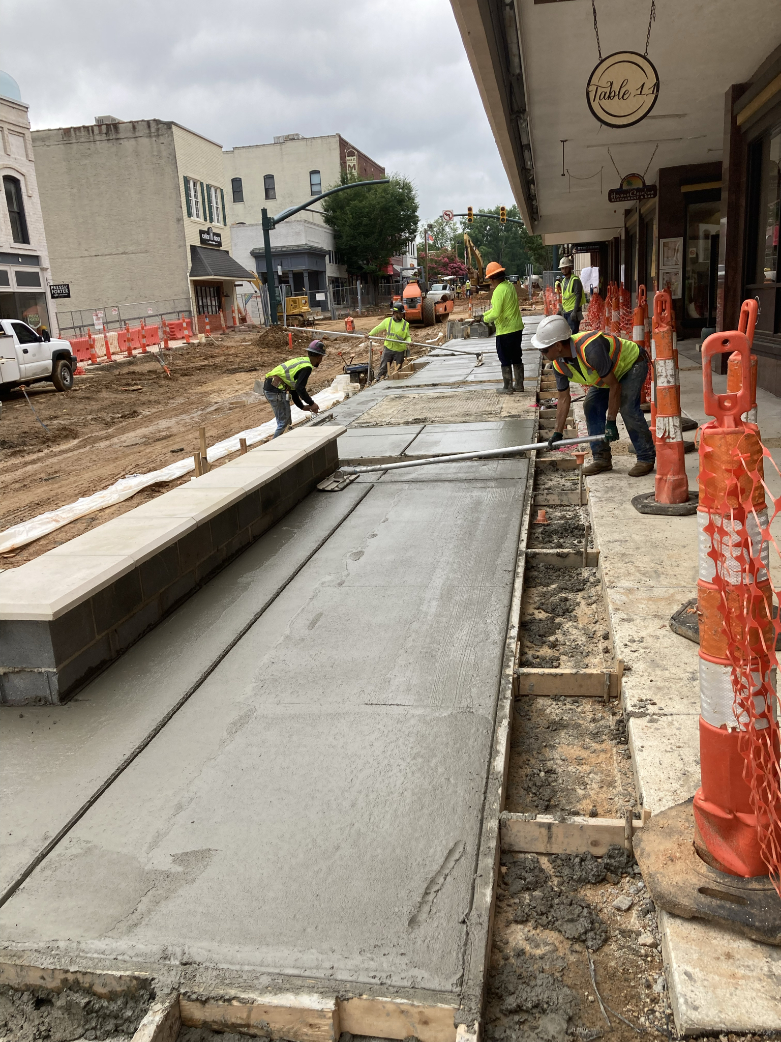 This week, south of Cabarrus Avenue, sidewalk crews were hard at work installing more sidewalks, retaining walls, and seat walls on the east side of Union St. They also installed light bases and started grading for new curbs.