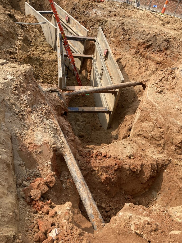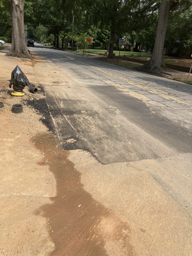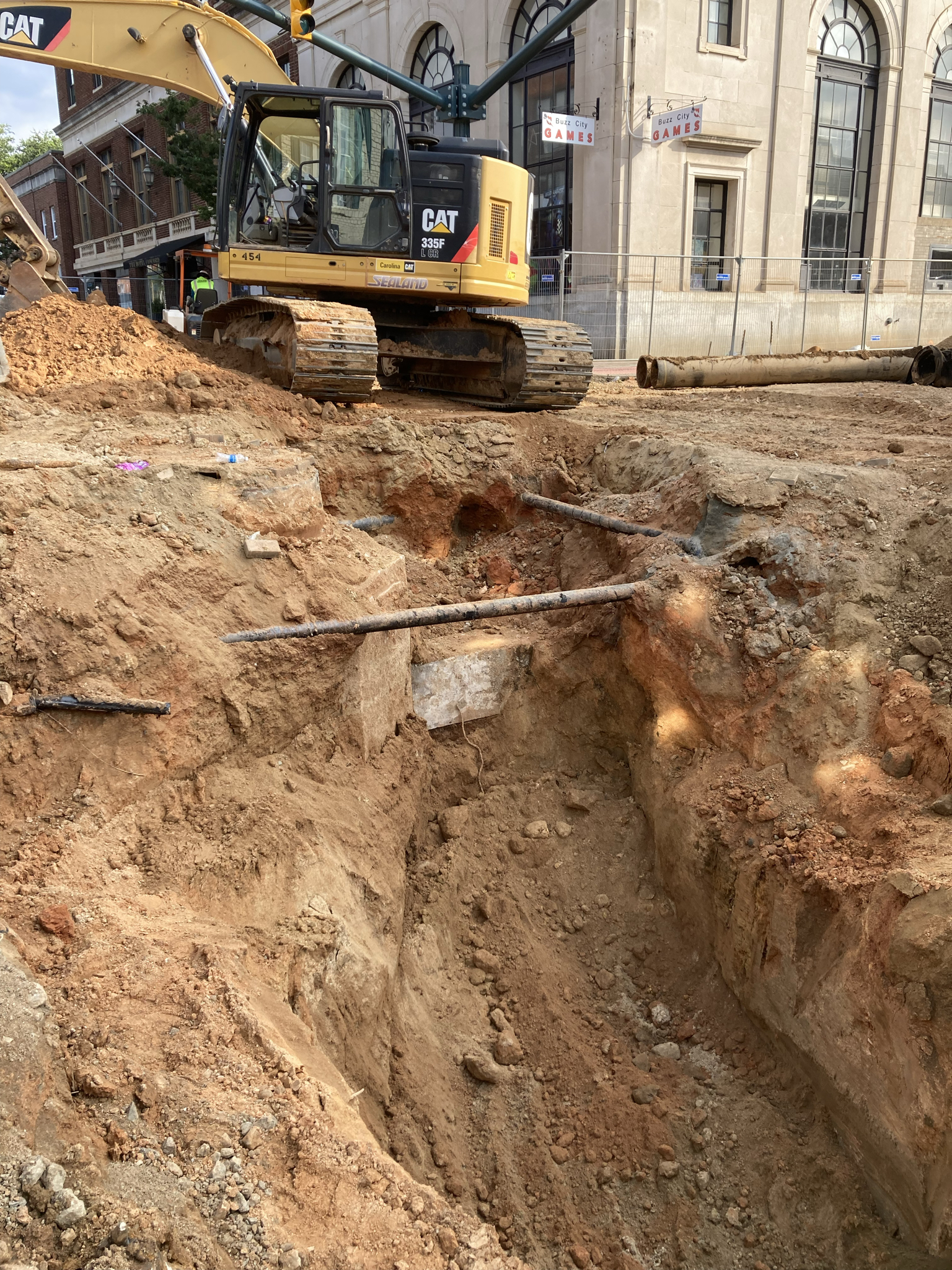 Infrastructure crews made progress in the Cabarrus Ave intersection as well. They carefully excavated and hand dug around an existing high voltage electrical duct bank and active gas lines and began installing the new 16″ water line through the intersection. This work will continue next week as well.